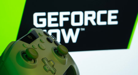 Dhaka, Bangladesh- 14 Nov 2025: A close-up of a gamepad with the Geforce Now seen on screen in the background.