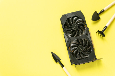 Cryptocurrency mining concept closeup with golden ethereum on top of a computer performant video card red fans