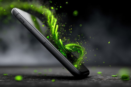 A sleek smartphone stands upright with green particles swirling around it, enhancing the modern and tech-inspired atmosphere. The dark background highlights the device and its energetic display.