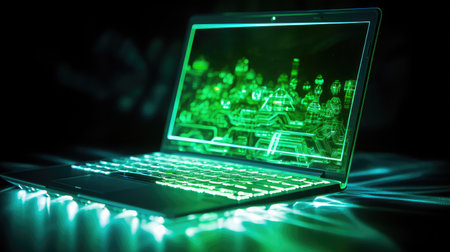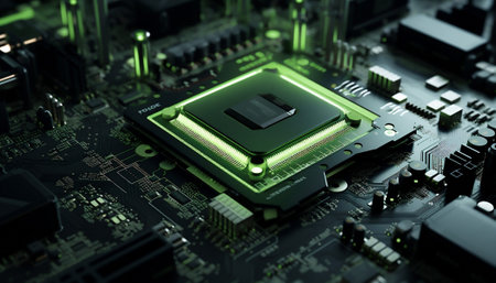 This image showcases a detailed view of a computer circuit board. It features a complex arrangement of electronic components in shades of gray and black with bright green accents. The composition is highly detailed and well-lit, providing a clean visual for various commercial and editorial applications.