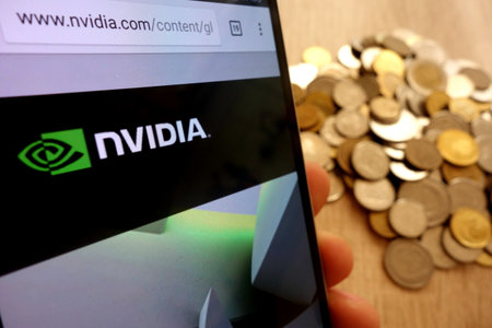 KONSKIE, POLAND - MAY 14, 2018: Nvidia website displayed on smartphone and stack of coins