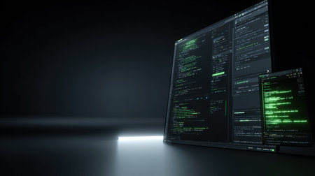 This image features modern computer screens displaying dynamic programming code in a sleek, dark setting, highlighting technological innovation and design elements.