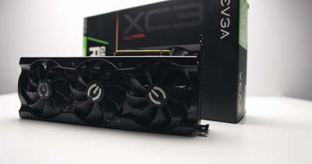BUDAPEST, HUNGARY - CIRCA 2020: EVGA gForce RTX 3080 graphics card which features Ampere architecture and raytracing technology
