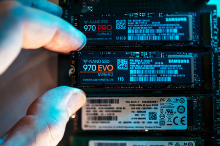 London, United Kingdom - Jan 18, 2019: Close-up view of man hand inserting in the M2 connector the new Samsung NVME V-Nand SSD Samsung 970 disk drive next to Pro and other brand