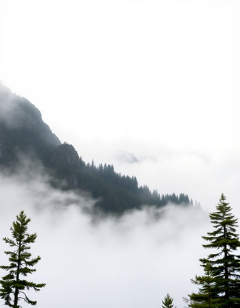 Misty trees rise dramatically in the mountains as morning fog envelops the forest landscape.