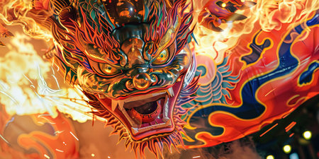Close up of a dragon head in a Chinese temple during a festival