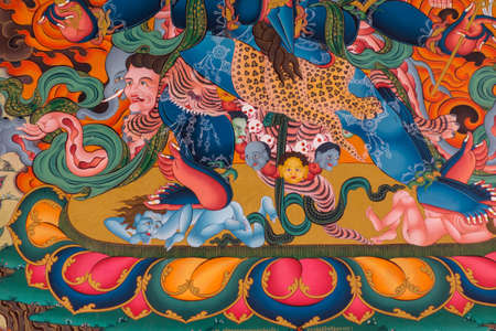 Coorg, India - October 29, 2013: Inside Padmasambhava Vihara of Namdroling Buddhist Monastery. Detail of wall painting: Devi Kali feet trampling humans. Vivid colors. Fire and skulls.