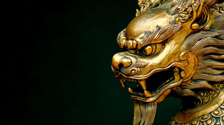 Golden lion statue on black background, detailed mane, powerful stance, symbol of strength, elegance.