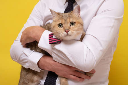 Man bonding with closed eyes to his surprised striped cat sitting at his knees