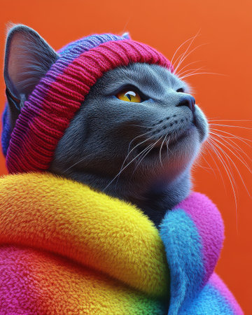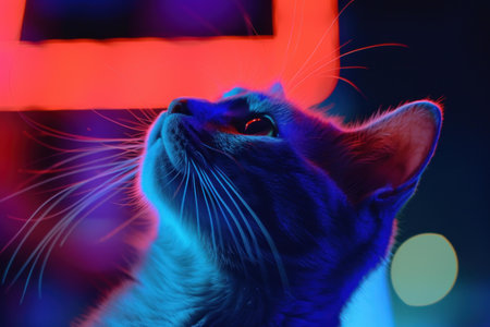 Cat with striking orange and blue lighting on face, close-up portrait in darkness. Dramatic feline gaze in studio light, artistic photography concept