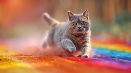 Playful Gray Cat Joyfully Running Across a Colorful Rainbow Path in Nature