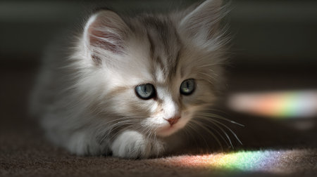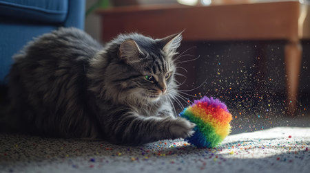 A charming domestic cat is engaged with a vibrant rainbow toy ball, creating a delightful scene filled with sparkling dust in a warm, cozy environment.