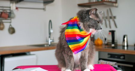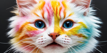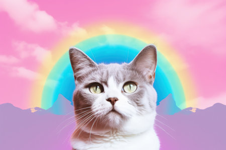 Contemporary art depiction of a cat with rainbow eyes isolated on a pink background symbolizing LGBT
