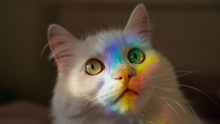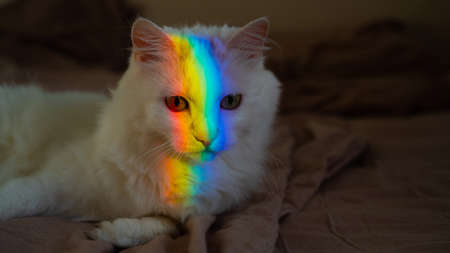 A white fluffy cat lies in the bedroom with a rainbow on its face.