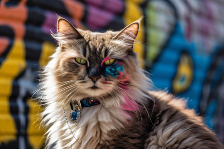 An AI generated illustration of a cute fluffy cat with paint on its fur near a graffiti wall