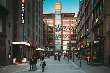 Helsinki, Finland - December 10, 2016: People Walking On Kluuvikatu Street In Winter Day. Street Decorated For Christmas And New Year Holidays