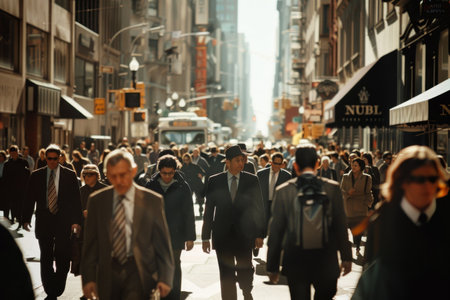 Crowded urban street with people walking next to towering buildings, A busy city street filled with people in business attire