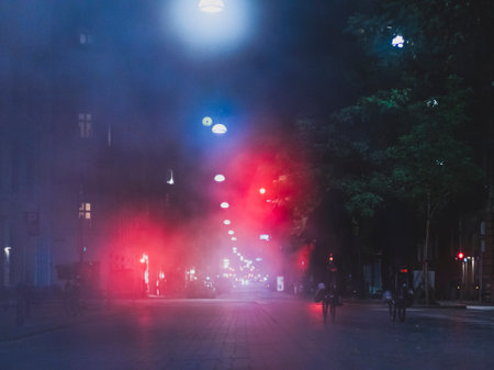 nighttime cityscape, with colorful lights shining and illuminating the streets, created with generative ai