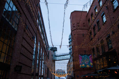 Modern architecture of the city of Oslo Norway during the winter with Christmas decoration in the snow-covered center.