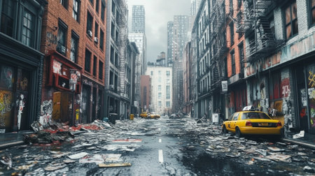 Abandoned urban street with yellow taxis and graffiti in overcast weather.