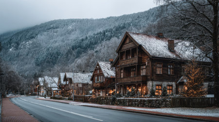 Houses with snowy roofs and lit windows line a road beside a snow-covered mountain. The scene displays a variety of brown and green hues under overcast lighting. The composition presents a street scene, potentially for editorial usage or to portray a winter landscape. It provides an image of a tranquil setting.