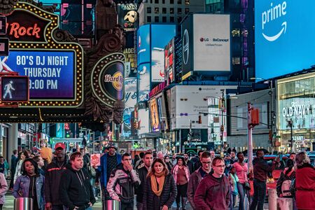 NEW YORK, USA - OCTOBER 11: Night scene of led signs and crowds of people in Times Square on October 11, 2019 in New York