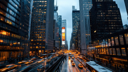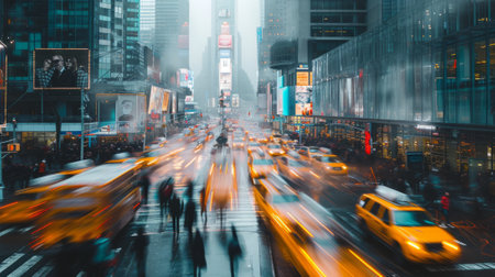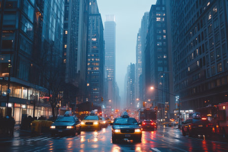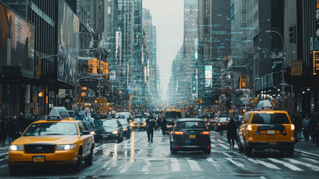 A bustling urban street scene showcases yellow taxis and pedestrians crossing a rain-soaked road, with an impressive skyscraper backdrop and digital overlay.