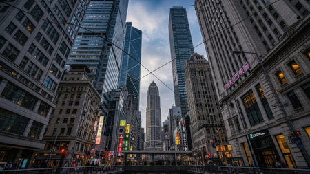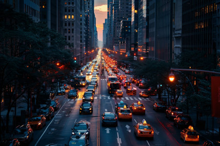 Busy metropolitan cityscape at dusk with skyline illuminated AI generated