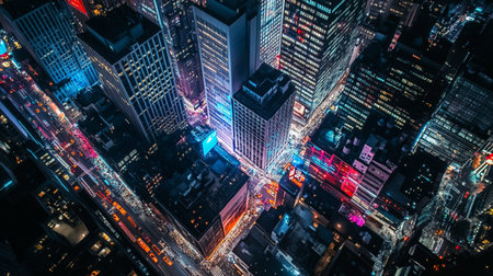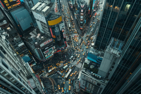 An aerial view of a bustling city intersection, captured in an image.. Generative AI