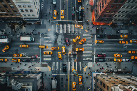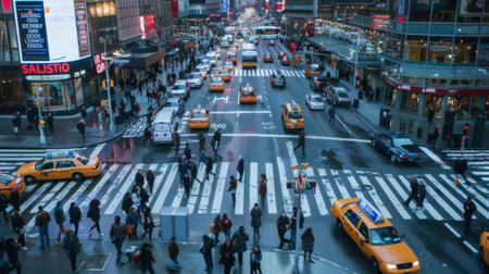 Overhead shot of a bustling city crosswalk with yellow taxis and pedestrians, capturing the vibrant urban life during rush hour. Resplendent.