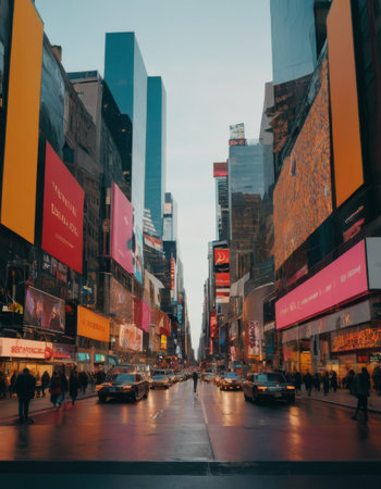 Crowds gather in Times Square as bright billboards illuminate the surroundings at dusk. Yellow taxis weave through the busy streets, and people enjoy the vibrant atmosphere