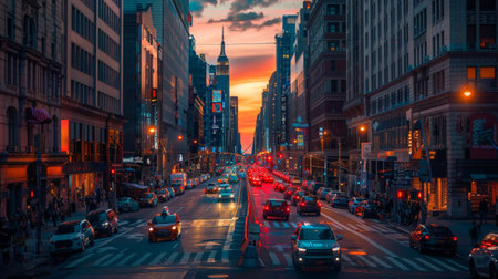 A captivating aerial view of a bustling city street at sunset, showcasing towering skyscrapers and the vibrant energy of urban life.