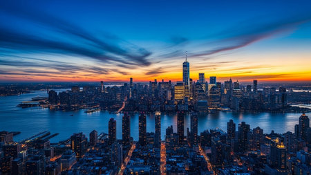 An expansive aerial view of the New York City skyline at sunset. The sky is a dramatic blend of deep blues and vibrant oranges, with streaking clouds adding texture. Numerous skyscrapers and buildings are illuminated, casting reflections on the water of the river. The city stretches towards the horizon, showcasing its vast urban landscape and architectural diversity.
