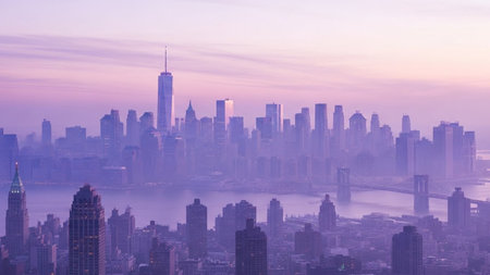 A sweeping panoramic view showcases a dense city skyline silhouetted against a soft, purple-hued sky at dusk. Numerous skyscrapers of varying heights dominate the scene, with iconic structures like One Trade Center and the Brooklyn Bridge visible in the distance. A body of water, likely a river, separates different parts of the city. The atmosphere is hazy and serene, with a gentle, diffused light creating a moody and peaceful ambiance. The sheer scale of the urban landscape is emphasized by...