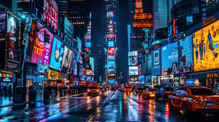 The image depicts Times Square at night, showcasing its iconic neon signs and billboards illuminating the bustling streets. The sidewalks are filled with pedestrians while cars navigate the wet pavement after a recent rain shower. The towering skyscrapers and vibrant advertisements create a dynamic and energetic atmosphere.