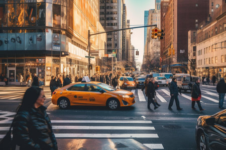 Cityscape depicts a busy intersection during daytime with tall skyscrapers. Cars and taxis navigate the crosswalk. The shot shows detailed architecture and a view of the street, with a dynamic composition that incorporates natural light and shadows creating an urban environment.