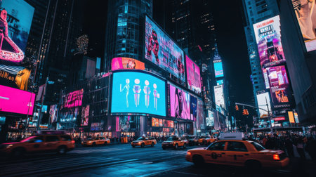 A busy city street with a large billboard in the background. The city is lit up at night, creating a vibrant and bustling atmosphere