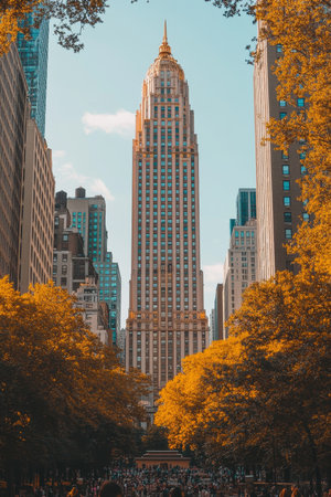Cityscape, Autumnal Splendor Majestic Tower Soars Above Trees Lining Avenue at Golden Hour