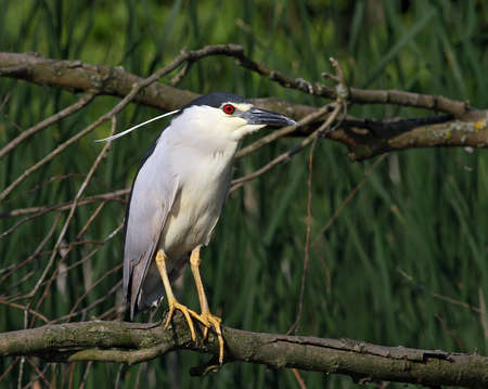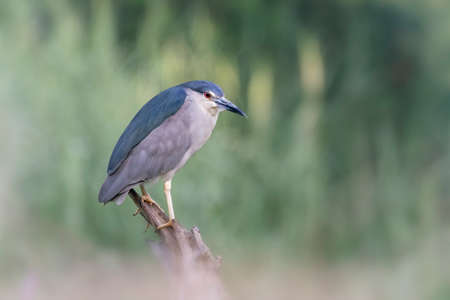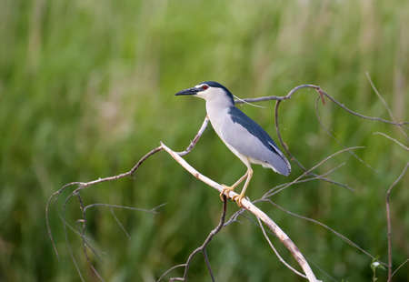 Beautiful Black-crowned Night Heron (Nycticorax nycticorax) on a branch in natural habitat. Blurry green background.