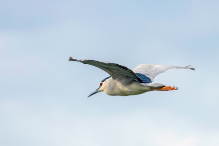 Black Crowned Night Heron in Fight Blue Sky (Nycticorax nycticorax)