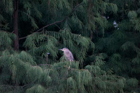 A Black Crowned Night Heron sitting on a pine branch.
