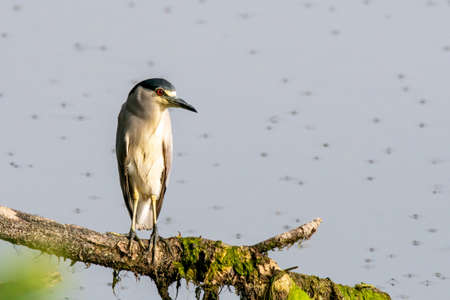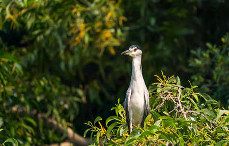 The black-crowned night heron (Nycticorax nycticorax), or black-capped night heron, commonly shortened to just night heron in Eurasia stands perched on a tree in the sunshine.