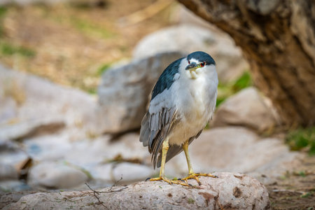 A cute black-crowned night heron perched on a tree branch with a blurred background
