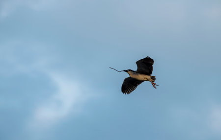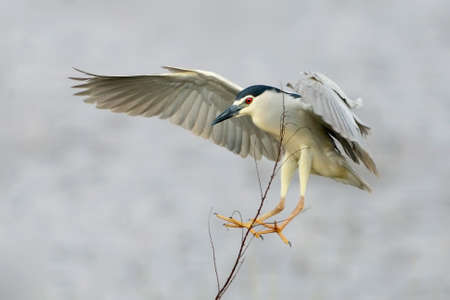 Black-crowned Night Heron in flight spreading their wings to slow down before landing with a stick in its beak