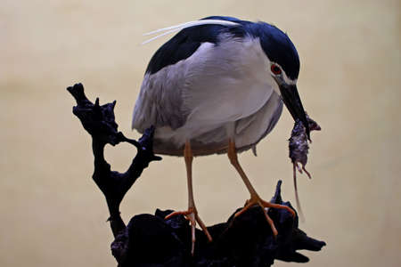 A black-crowned night heron (Nycticorax nycticorax) is eating a small prey.