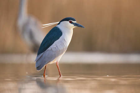 Black-crowned Night Heron (Nycticorax nycticorax) fishing at night in Hungary. Little Egret in the background.