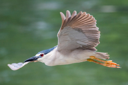 A Black-crowned Night Heron flying over water