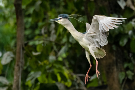 Black-crowned Night Heron jumping up and flapping its wings to take off looking into a distance