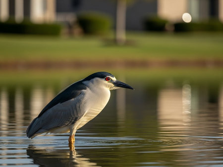 Black crowned night heron waiting at pond edge for a fish