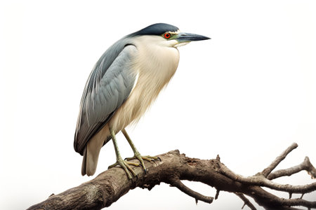 Image of black-crowned night heron bird on a branch on a white background. Birds. Animals. Illustration, Generative AI.